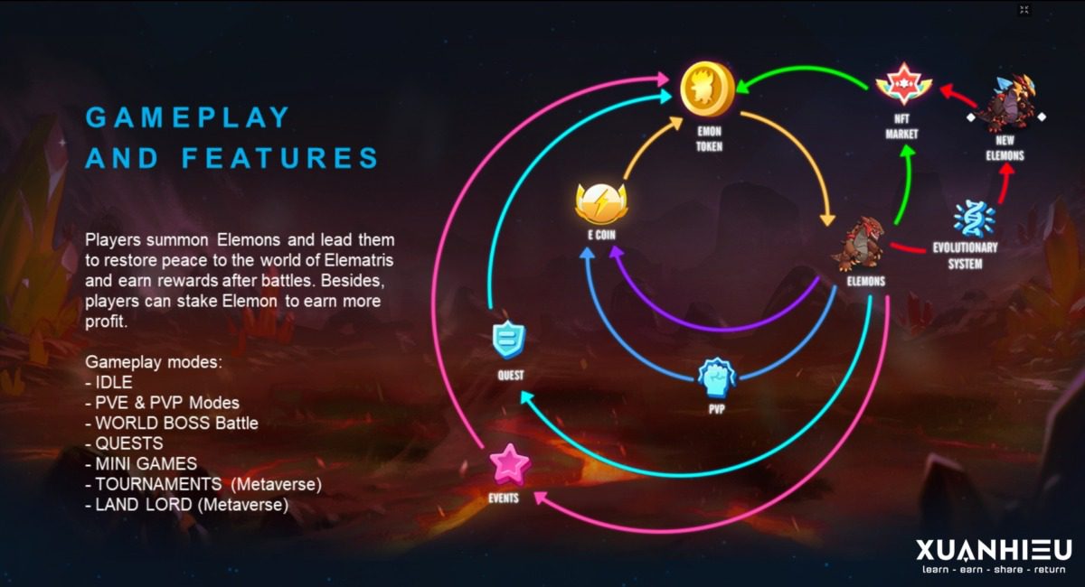 Elemon được lấy cảm hứng từ thế giới bí ẩn và xinh đẹp của Elematris, nhiệm vụ của là xây dựng một nền tảng toàn diện về quái vật kỹ thuật số cho phép hàng triệu cá nhân tham gia vào thế giới trò chơi dựa trên NFT và blockchain một cách đơn giản, sáng tạo và thú vị. Ngoài ra game này còn đang theo trend Metaverse như cách mà Facebook đổi tên thành Meta hướng đến.