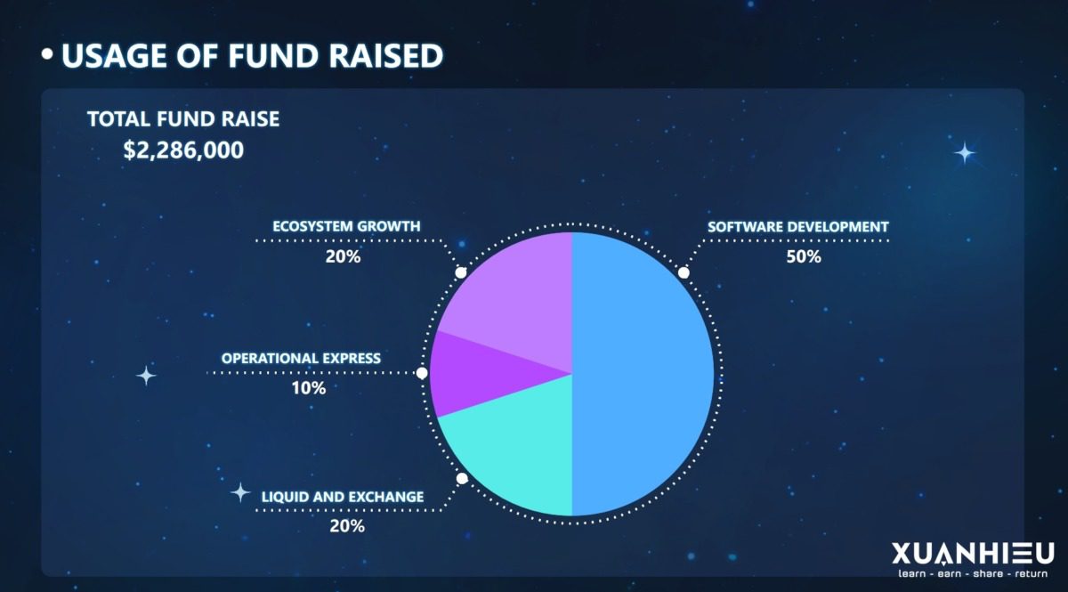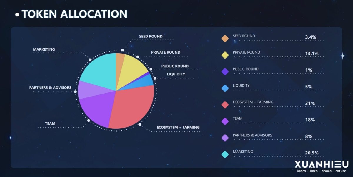 | Đối tác & Cố vấn | 8.00% | 160,000,000 | 0% | 12,5% vào tuần thứ 4, khóa trong 2 tháng, sau đó 12,5% hàng quý |