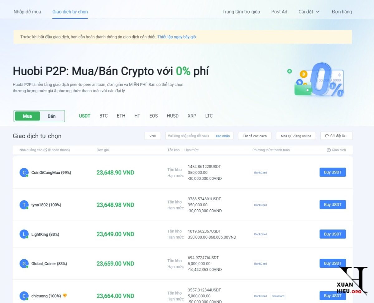 2. Huobi P2P: Mua/Bán Crypto với 0% phí