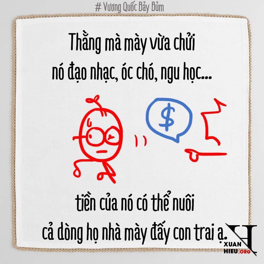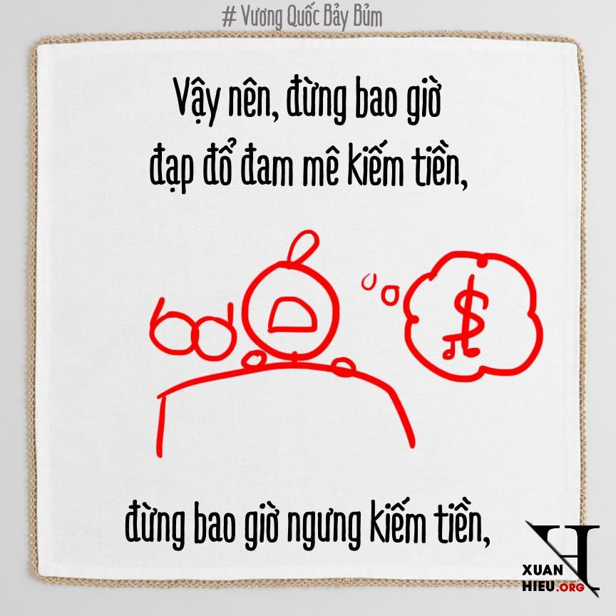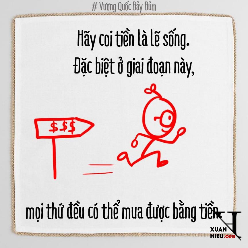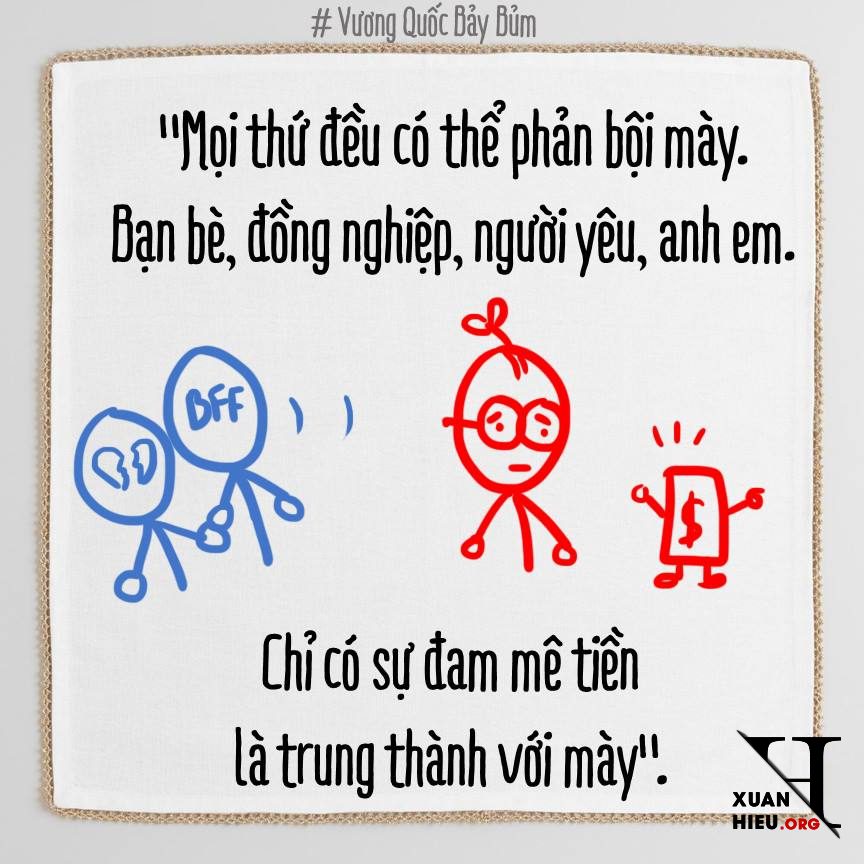 14. Tiền đéo bao giờ phản bội mày: “Mọi thứ đều có thể phản bội mày, Bạn bè, đồng nghiệp, người yêu, anh em, …. Chỉ có sự đam mê tiền là trung thành với mày, vậy nên, đừng bao giờ đạp đổ đam mê kiếm tiền, đừng bao giờ ngưng kiếm tiền, hãy coi tiền là lẽ sống, ở chế độ này, mọi thứ đều có thể mua được bằng tiền. Đừng ảo tưởng 1 cuộc sống: ‘1 mái nhà tranh, 2 quả tim vàng'. Đéo có tiền thì mua đất đâu mà xây nhà tranh.”