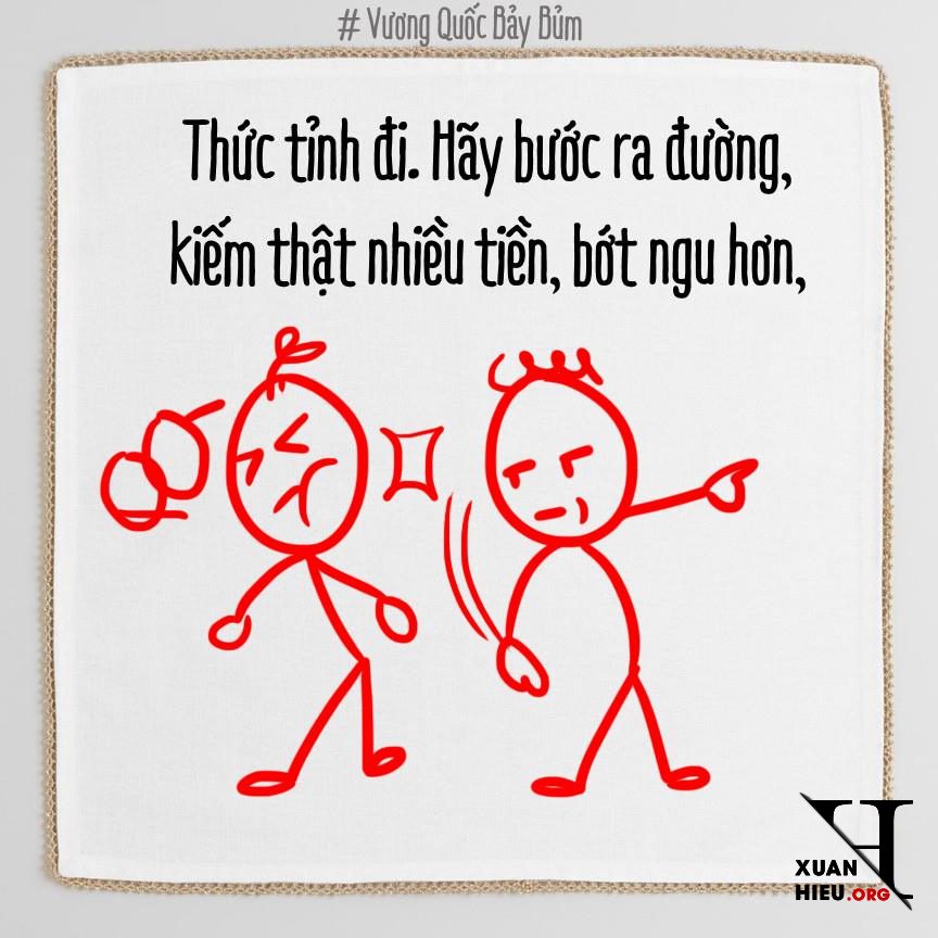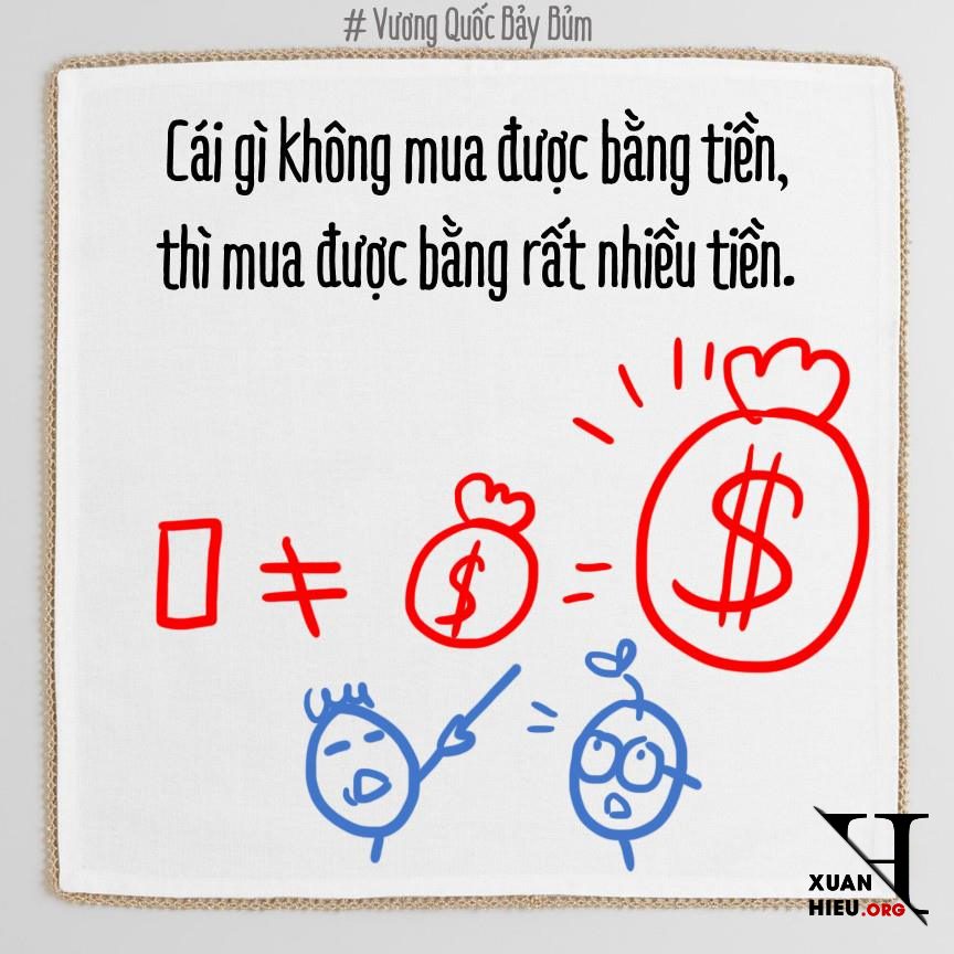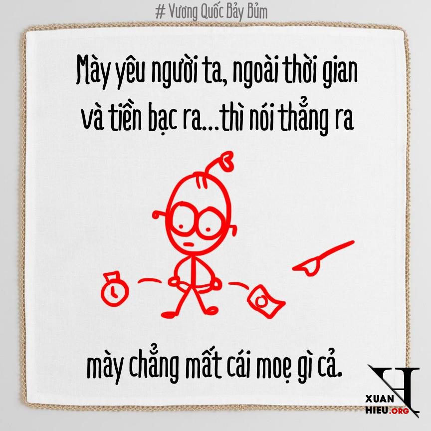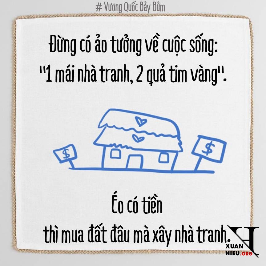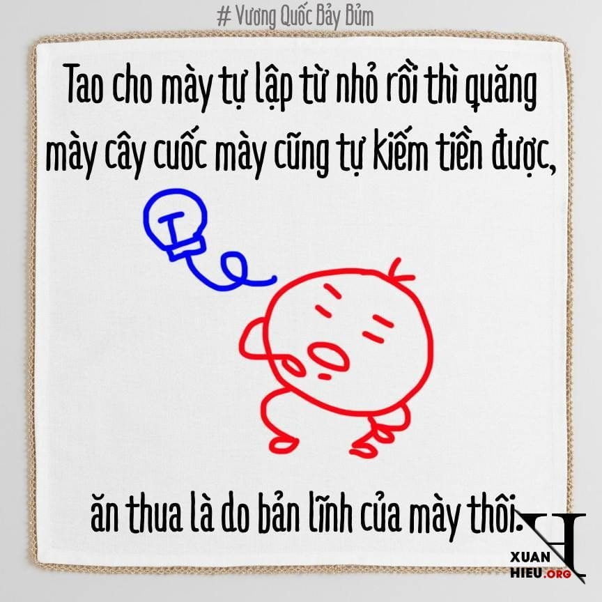 14. Tiền đéo bao giờ phản bội mày: “Mọi thứ đều có thể phản bội mày, Bạn bè, đồng nghiệp, người yêu, anh em, …. Chỉ có sự đam mê tiền là trung thành với mày, vậy nên, đừng bao giờ đạp đổ đam mê kiếm tiền, đừng bao giờ ngưng kiếm tiền, hãy coi tiền là lẽ sống, ở chế độ này, mọi thứ đều có thể mua được bằng tiền. Đừng ảo tưởng 1 cuộc sống: ‘1 mái nhà tranh, 2 quả tim vàng'. Đéo có tiền thì mua đất đâu mà xây nhà tranh.”