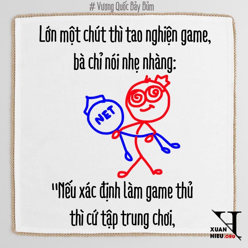 Khi con nghiện game: Lớn một chút thì tao nghiện game, bả chỉ nói nhẹ nhàng, “nếu xác định làm game thủ thì cứ tập trung chơi, nhưng mà tao cho mày 1 năm, chơi game đéo tới nơi tới chôn thì tao cho đi nghĩa vụ”. Rốt cuộc tao chọn học và bỏ game vì tao chợt nhận ra, game thủ ở VN bạc lắm .