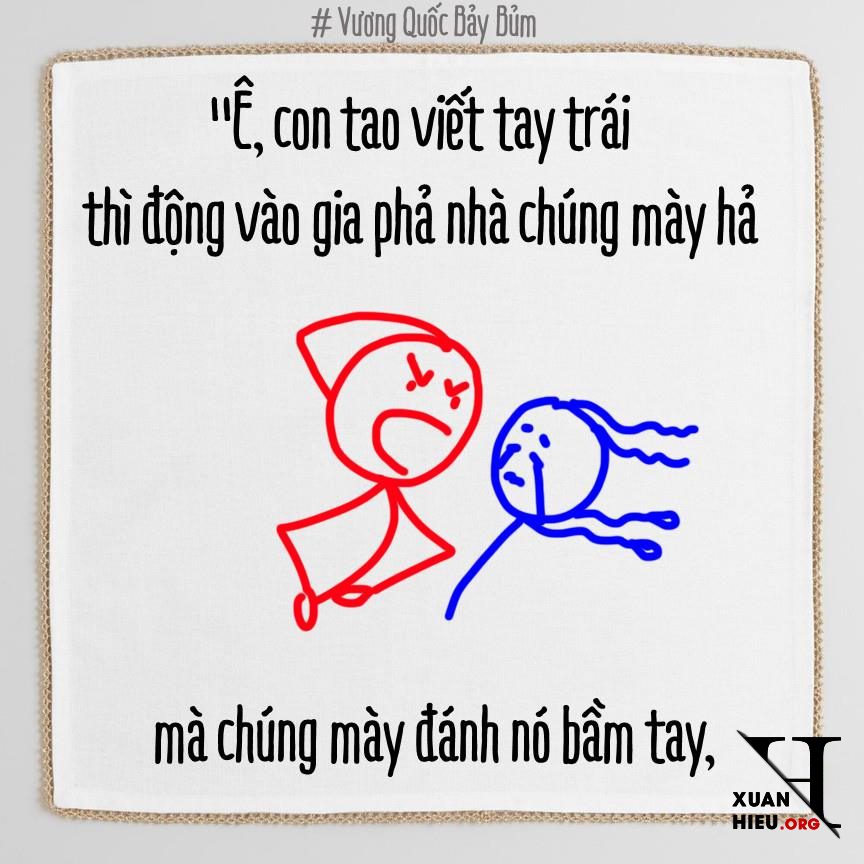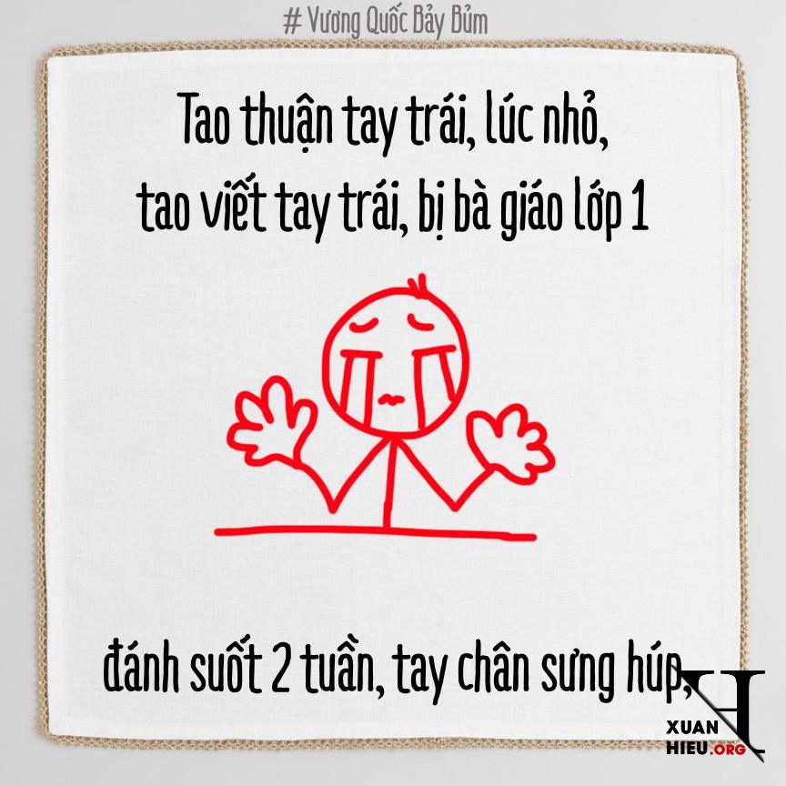 2. Thuận tay trái: Tao thuận tay trái, lúc nhỏ tao viết tay trái, bị bà cô lớp 1 đánh suốt 2 tuần, tay chân sưng húp, bà già tao đợt đó đi làm xa về nhìn tay tao bầm tím, dắt tao lên trường, tìm bà hiệu trưởng: “Ê CON GIÁO VIÊN PHONG KIẾN, Con tao viết tay trái thì động vào gia phả nhà mày hả mày đánh nó bầm tay, nó hư nó quậy mày đánh chết mẹ nó cũng được nhưng vì viết tay trái mà mày đánh nó là mày chết mẹ mày với tao.” Bà hiệu trưởng phải sang nhà tao xin lỗi nhưng mẹ tao vẫn quyết định chuyển trường cho tao.