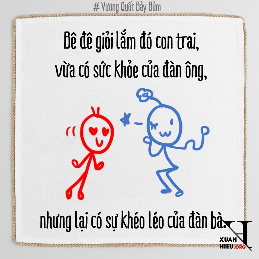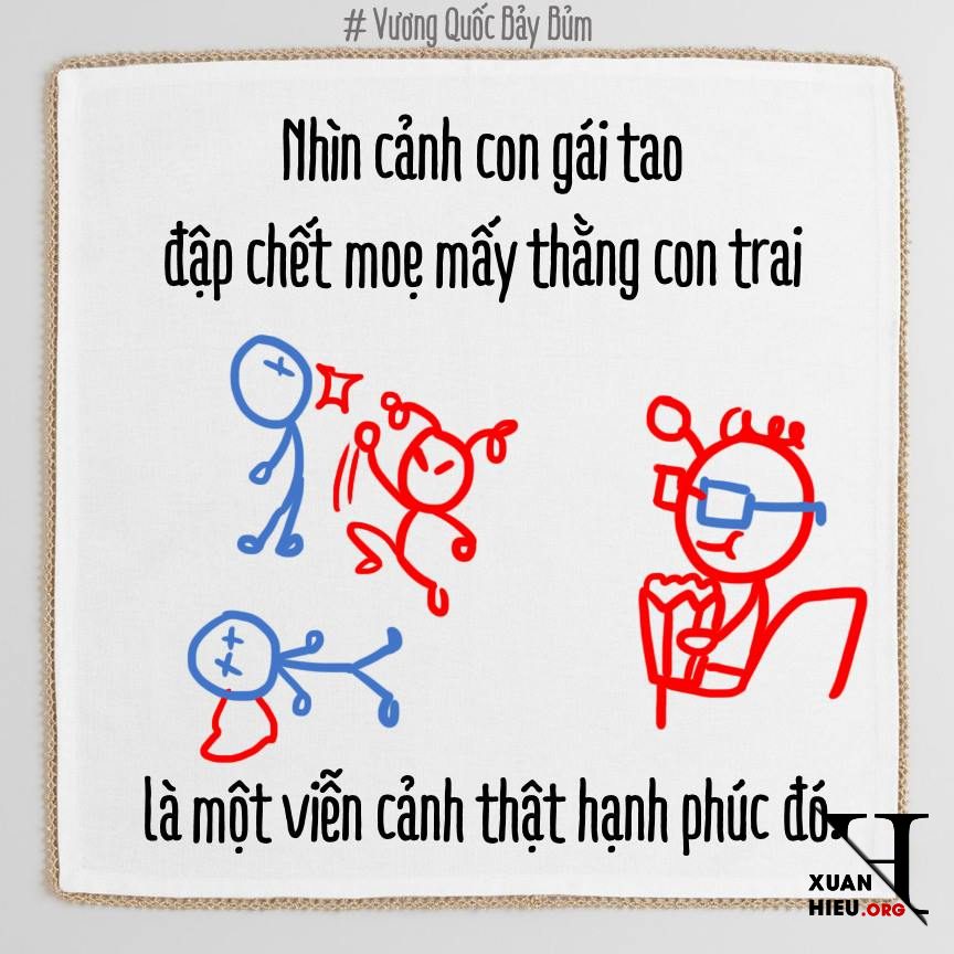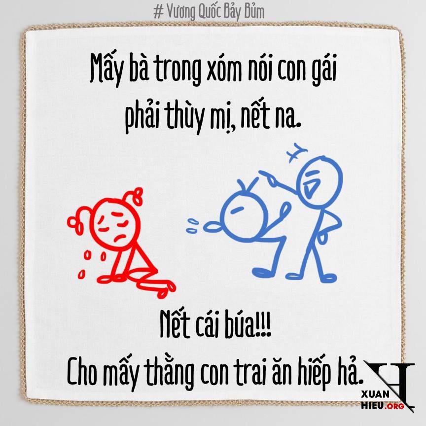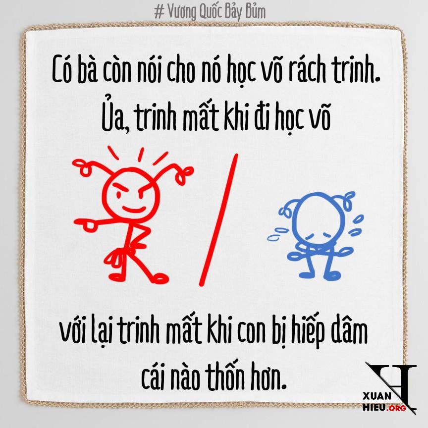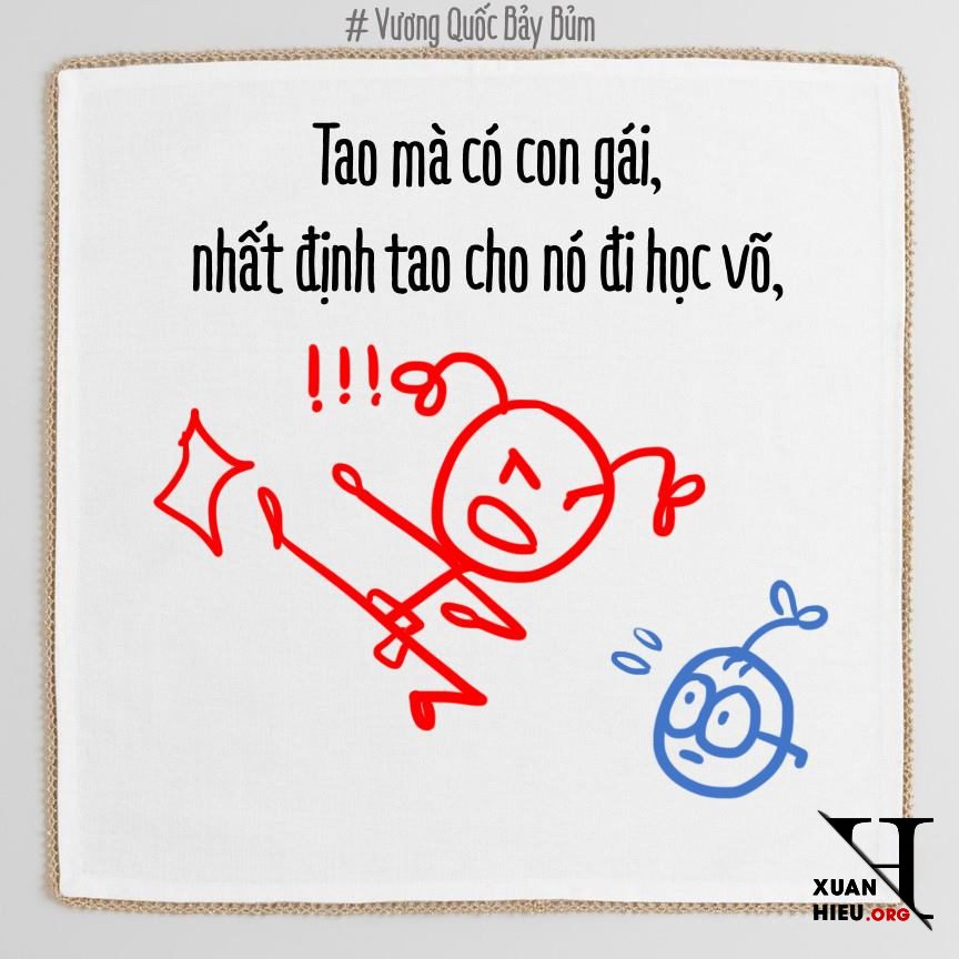 16. Con gái phải tự bảo vệ được mình: “Tao mà có con gái, nhất định tao cho nó đi học võ, mấy bà trong xóm nói con gái phải thùy mị, nết na. Nết cái búa, cho mấy thằng con trai ăn hiếp nó hả. Có bà còn nói cho nó học võ rách trinh . Ủa, trinh mất khi đi học võ với lại trinh mất khi con bị hiếp dâm cái nào thốn hơn. Nhìn cảnh con gái tao đập chết mẹ mấy thằng con trai là một viễn cảnh thật hạnh phúc đó.”