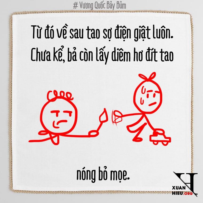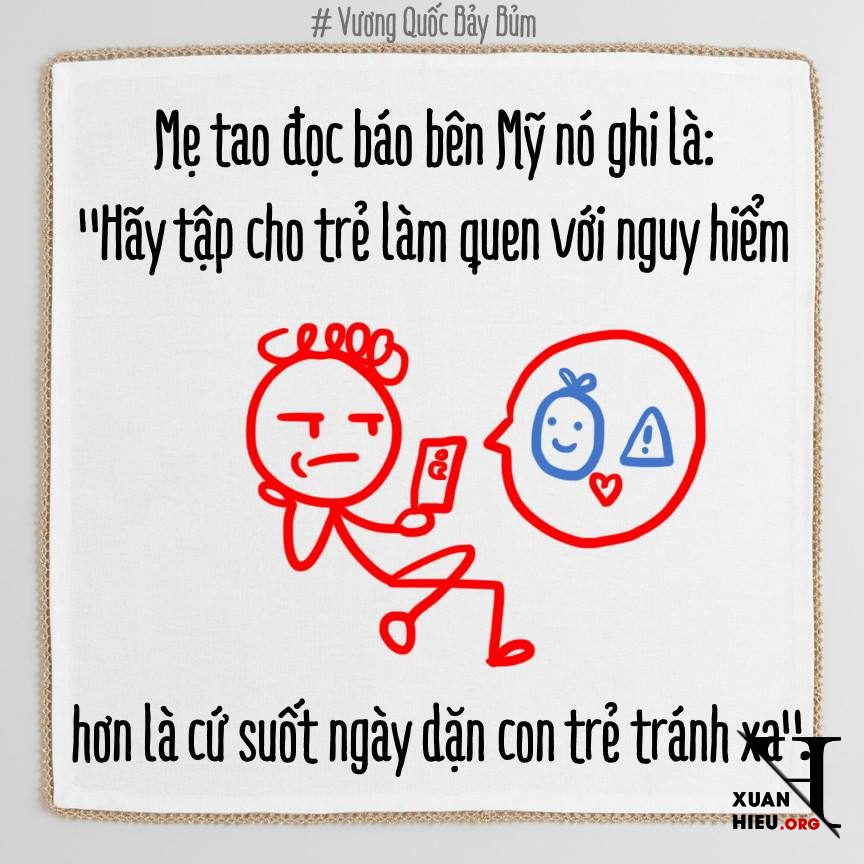 6. Làm quen với nguy hiểm: Mẹ tao đọc báo bên Mỹ nó ghi là: “hãy tập cho trẻ nhỏ làm quen với nguy hiểm hơn là cứ suốt ngày dặn con trẻ tránh xa nguy hiểm”. Thế là bả thực hành quán triệt luôn, bả hay lấy mấy cái hộp quẹt điện, có cái đồ bấm điện rồi suốt ngày chích tao thôi. Chích xong còn nói mai mốt con thọt tay vào ổ điện nó cũng tê vậy đó. Từ đó về sau tao sợ điện giật luôn. Chưa kể, bả còn lấy diêm hơ đít tao nóng bỏ mẹ. :((.