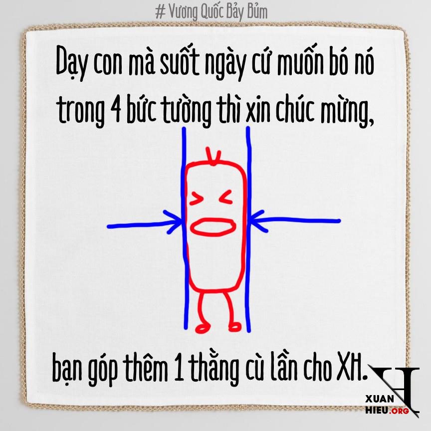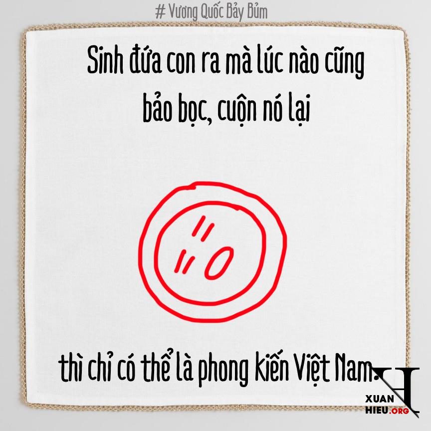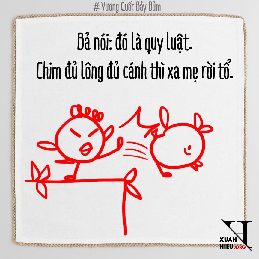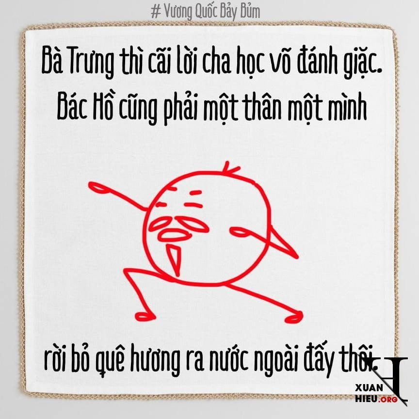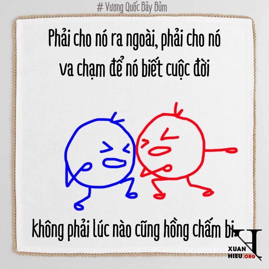 28. Muốn con thành vĩ nhân thì đừng bao bọc: “Sinh đứa con ra mà lúc nào cũng bảo bọc, cuộn nó lại thì chỉ có thể là Phong kiến Việt Nam, một chế độ tự giết chết con mình. Không tin m để ý, những danh nhân nổi tiếng trong lịch sử phong kiến toàn là bứt gia phong ra để tìm lối đi riêng. Bà trưng thì cãi lời cha học võ đánh giặc, hay Bác Hồ cũng phải một thân một mình bôn ba đi ra nước ngoài tìm đường cứu nước đấy thôi. Dạy con mà suốt ngày cứ muốn bó nó trong 4 bức tường thì chúc mừng, bạn đã đào tạo ra thêm 1 thằng vô dụng nữa cho xã hội. Phải cho nó ra ngoài, phải cho nó va chạm để nó biết cuộc đời không phải lúc nào cũng màu hồng chấm bi.”