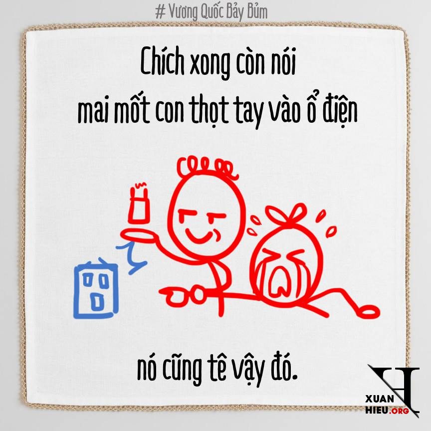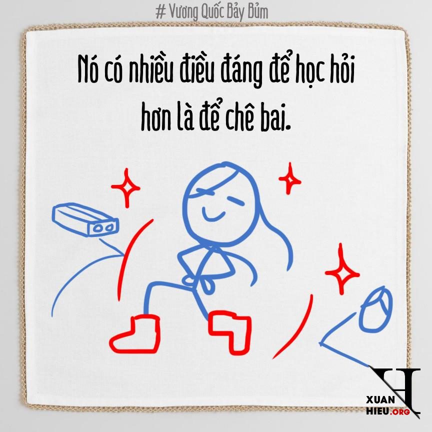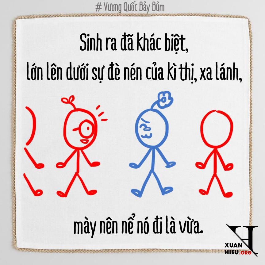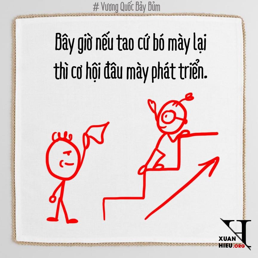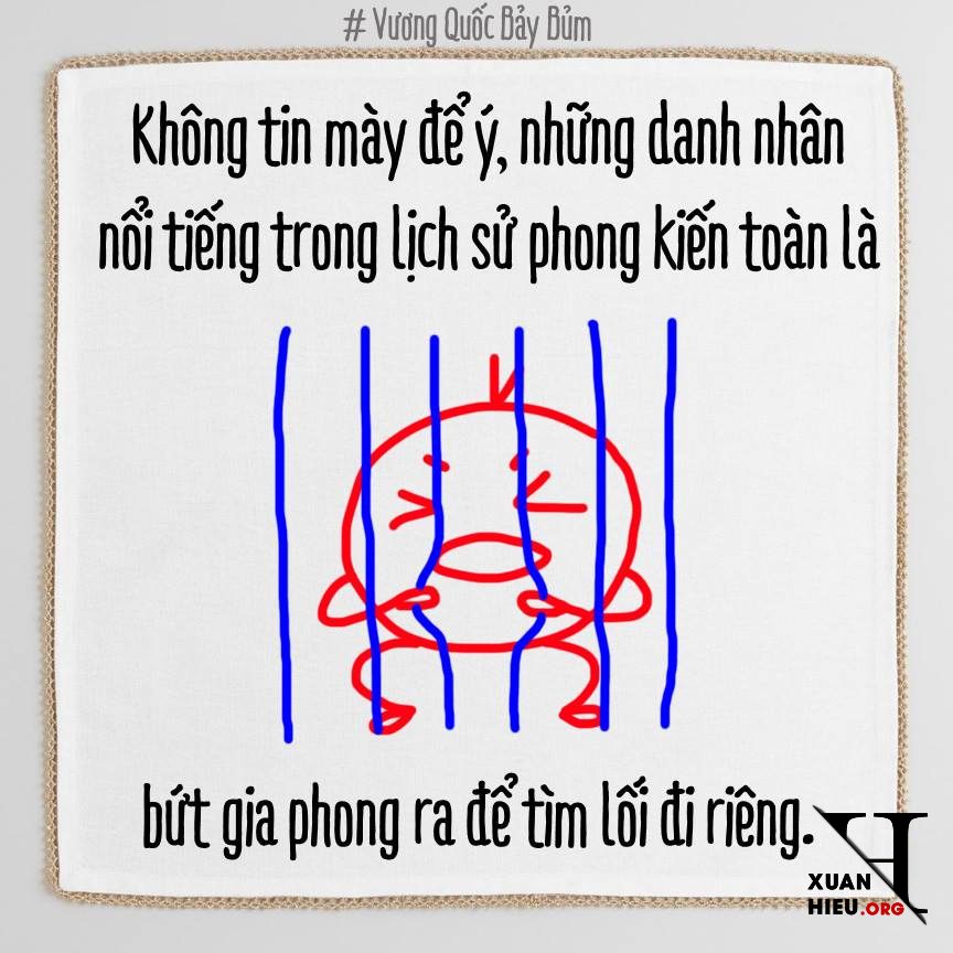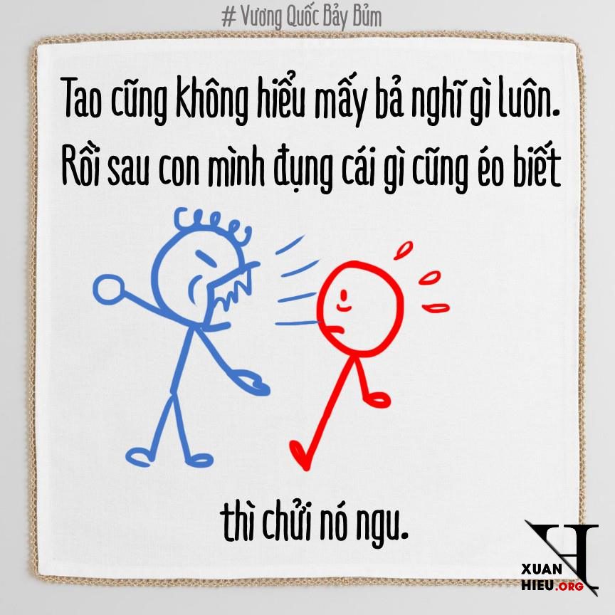 28. Muốn con thành vĩ nhân thì đừng bao bọc: “Sinh đứa con ra mà lúc nào cũng bảo bọc, cuộn nó lại thì chỉ có thể là Phong kiến Việt Nam, một chế độ tự giết chết con mình. Không tin m để ý, những danh nhân nổi tiếng trong lịch sử phong kiến toàn là bứt gia phong ra để tìm lối đi riêng. Bà trưng thì cãi lời cha học võ đánh giặc, hay Bác Hồ cũng phải một thân một mình bôn ba đi ra nước ngoài tìm đường cứu nước đấy thôi. Dạy con mà suốt ngày cứ muốn bó nó trong 4 bức tường thì chúc mừng, bạn đã đào tạo ra thêm 1 thằng vô dụng nữa cho xã hội. Phải cho nó ra ngoài, phải cho nó va chạm để nó biết cuộc đời không phải lúc nào cũng màu hồng chấm bi.”