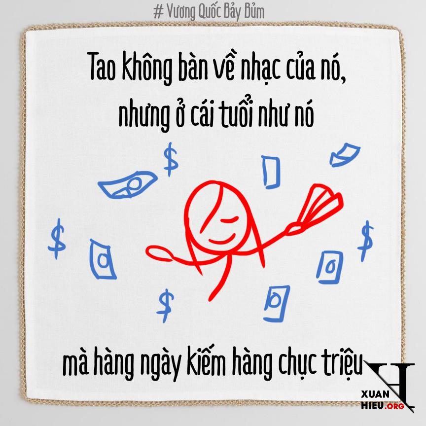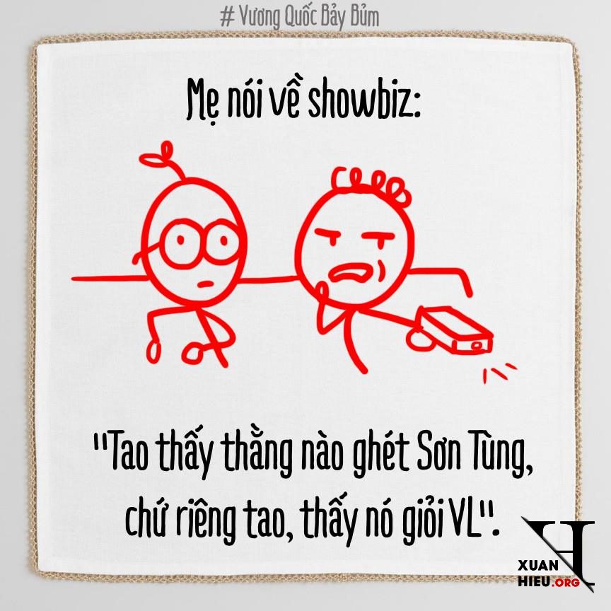 15. Sơn Tùng MTP và Showbiz: Mẹ nói về showbiz: “Tao thấy thằng nào ghét Sơn Tùng MTP chứ riêng tao đọc báo tao thấy nó giỏi VL. Tao không bàn về nhạc của nó, nhưng Ở cái tuổi như nó mà hàng ngày kiếm hàng chục triệu mà chẳng vi phạm gì pháp luật, nó có nhiều điều đáng để học hỏi hơn là để chê bai. Thằng mà mày vừa chửi nó đạo nhạc, óc chó, ngu học…, tiền của nó có thể nuôi cả dòng họ nhà mày đấy con trai ạ.