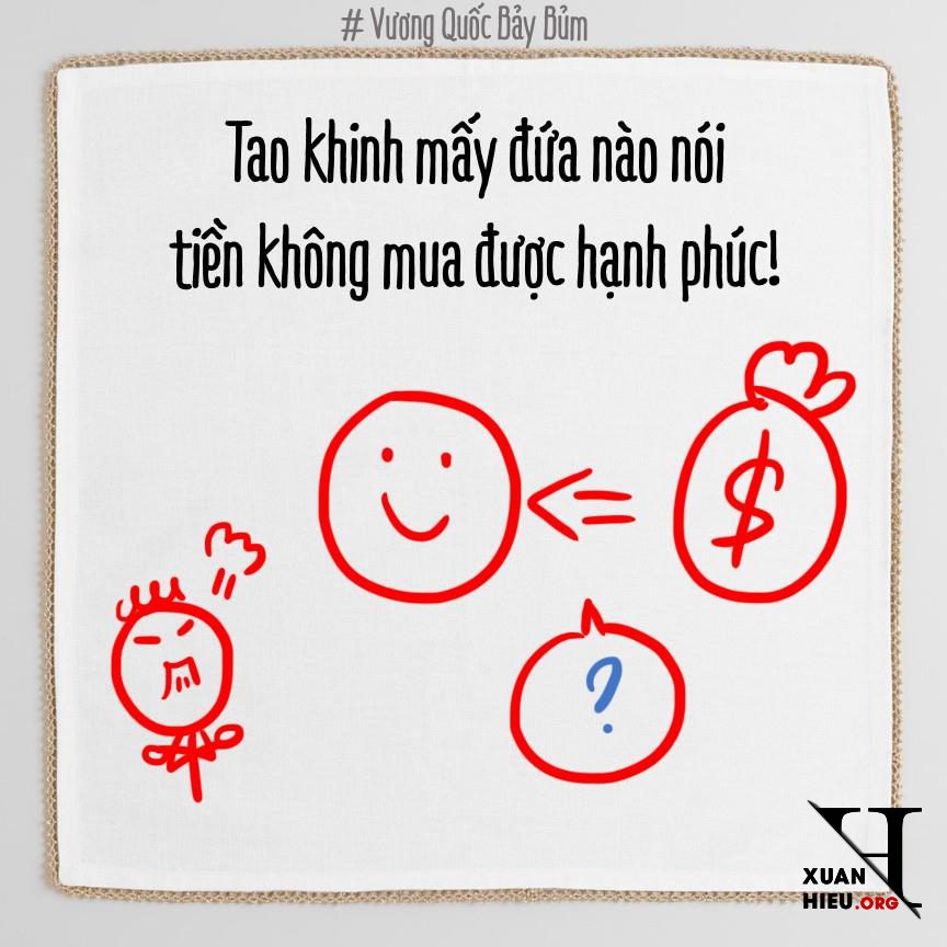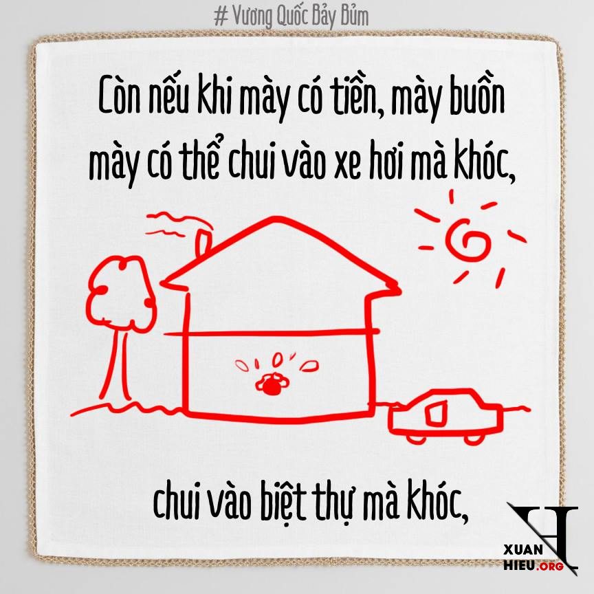13. Tiền chắc chắn mua được hạnh phúc: “Tao khinh mấy đứa nào nói tiền không mua được hạnh phúc! Cái gì không mua được bằng tiền, thì mua được bằng rất nhiều tiền. Này nhé, khi mày buồn mà mày không có tiền, cùng lắm mày ra quán, mua được chai bia con mực rồi ngồi nhìn lại vẫn tay trắng. Ngu vcl chưa. Còn nếu khi m có tiền, m buồn, m có thể chui vào xe hơi mà khóc, chui vào biệt thự mà khóc, khóc ở Hội An, khóc ở Đà Nẵng, khóc ở bất cứ nơi nào, qua Mỹ, Châu Âu, Nhật mà khóc cũng được.”