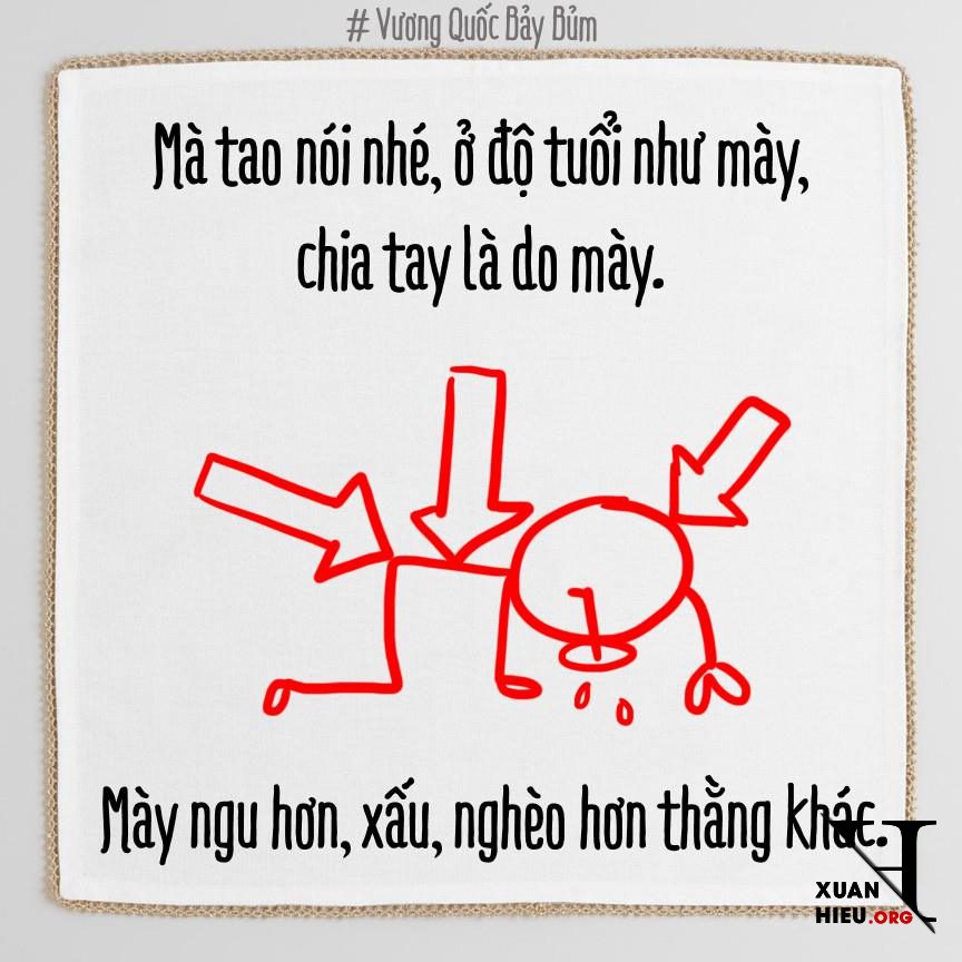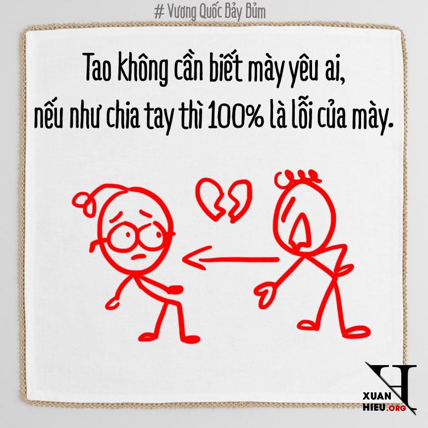 18. Chia tay lỗi 100% ở con trai: Tao không cần biết mày yêu ai, nếu như chia tay thì 100% là lỗi của mày, đừng có dăng tus than thở, oan ức, kêu ca, đổ lỗi cho người ta. M yêu người ta, ngoài thời gian và tiền bạc ra thì nói thẳng ra mày chẳng mất cái mẹ gì cả. Còn con gái người ta, mất nhiều lắm, mất cả thanh xuân để chờ mà mày làm sao hiểu được.