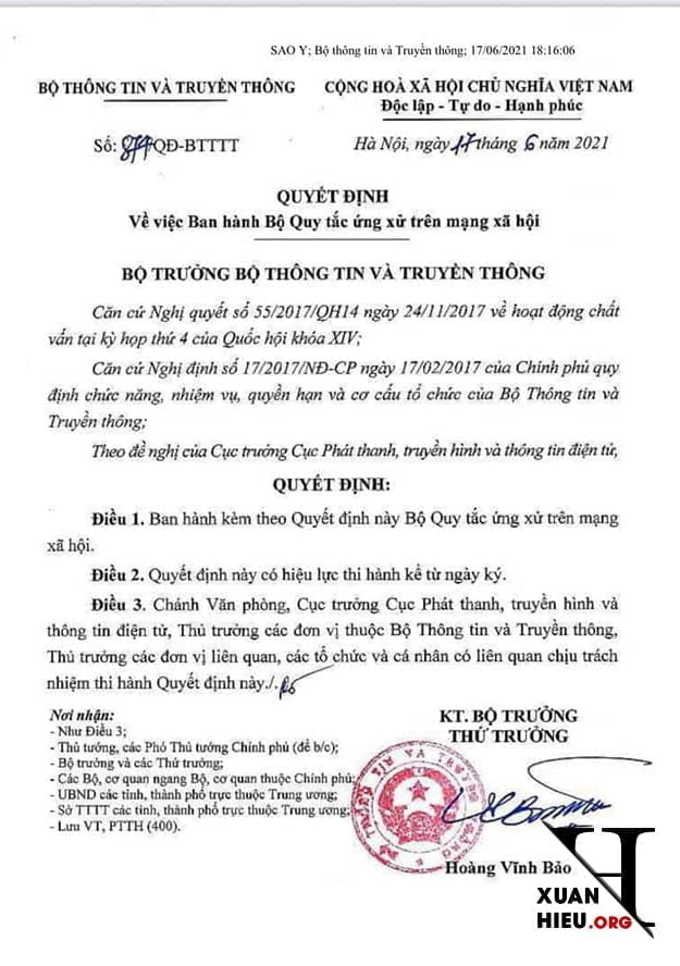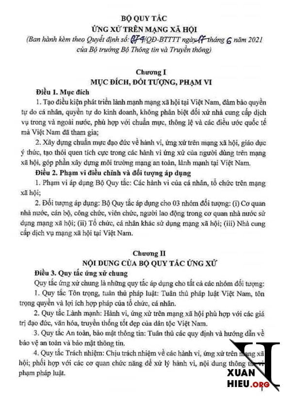 Bộ trưởng Bộ Thông tin – Truyền thông vừa ký ban hành Quyết định 874/QĐ-BTTTT về việc Ban hành Bộ Quy tắc ứng xử trên mạng xã hội (ngày 17/6/2021). Bộ quy tắc này đề ra những yêu cầu chung cho 3 nhóm đối tượng: Cơ quan nhà nước và nhân sự thuộc quản lý của cơ quan nhà nước; tổ chức, cá nhân ngoài nhà nước và nhà cung cấp dịch vụ MXH tại Việt Nam.