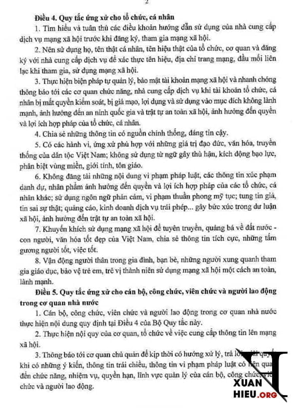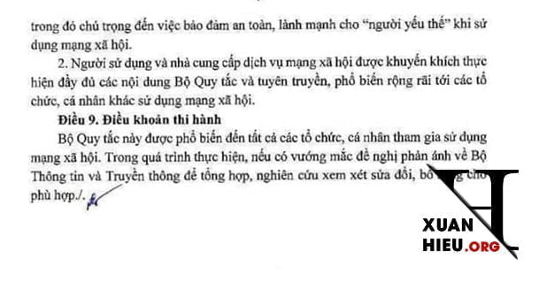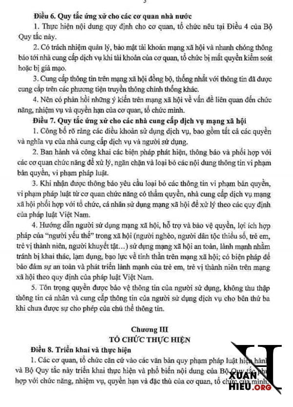 - Các cơ quan, tổ chức căn cứ vào các văn bản quy phạm pháp luật hiện hành và Bộ Quy tắc này triển khai thực hiện và phổ biến nội dung của Bộ Quy tắc phù hợp với chức năng, nhiệm vụ, quyền hạn và đặc thù của cơ quan, tổ chức của mình, trong đó chú trọng đến việc bảo đảm an toàn, lành mạnh cho “người yếu thế” khi sử dụng mạng xã hội.